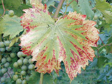 Deficiency symptoms are seen on the older basal leaves and start with leaf margin yellowing that moves inward. The leaf veins stay green the longest and the areas between become pale green and often creamy white. In red grapes, there may be a reddish colouring that develops between the veins (like the picture below).